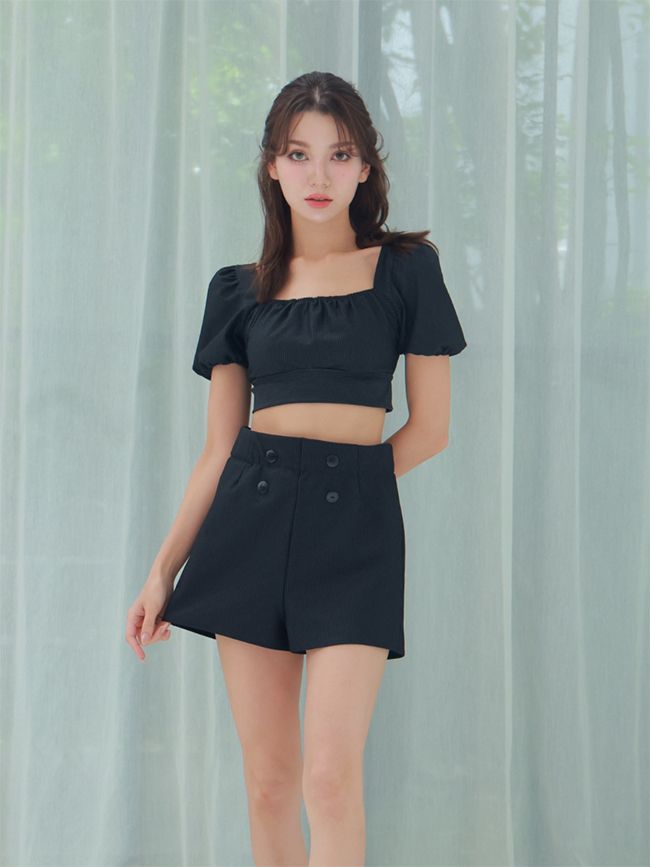 ペプラムトップとショートボトムの組み合わせ。