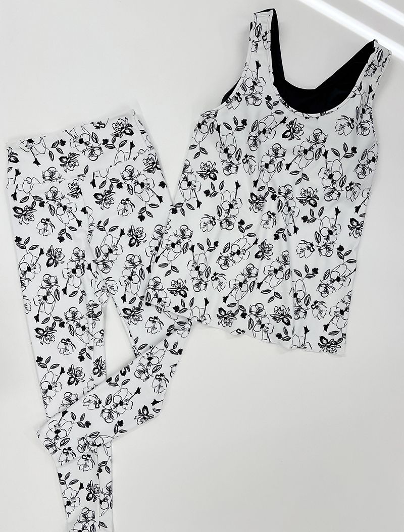モノクロ線画フラワープレーンレギュラーレギンス・トップス