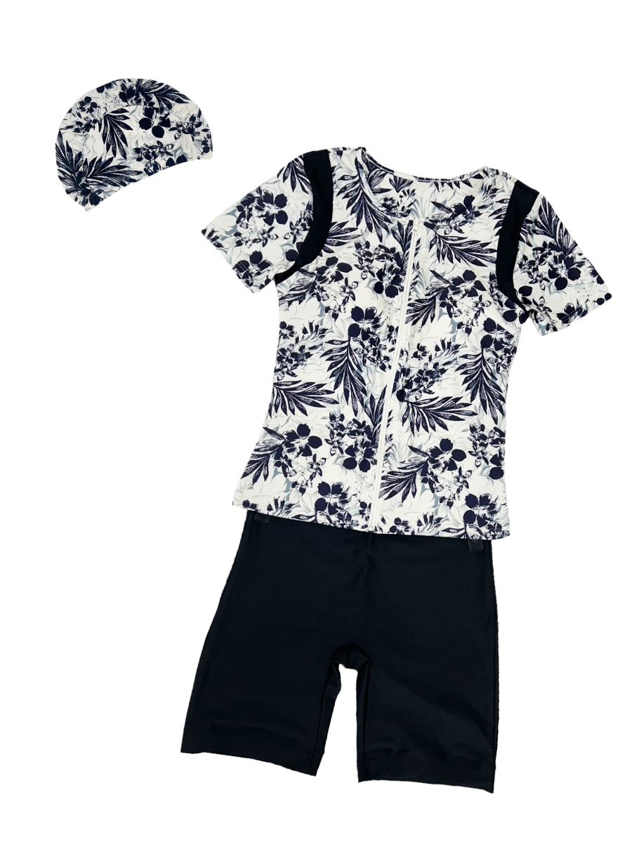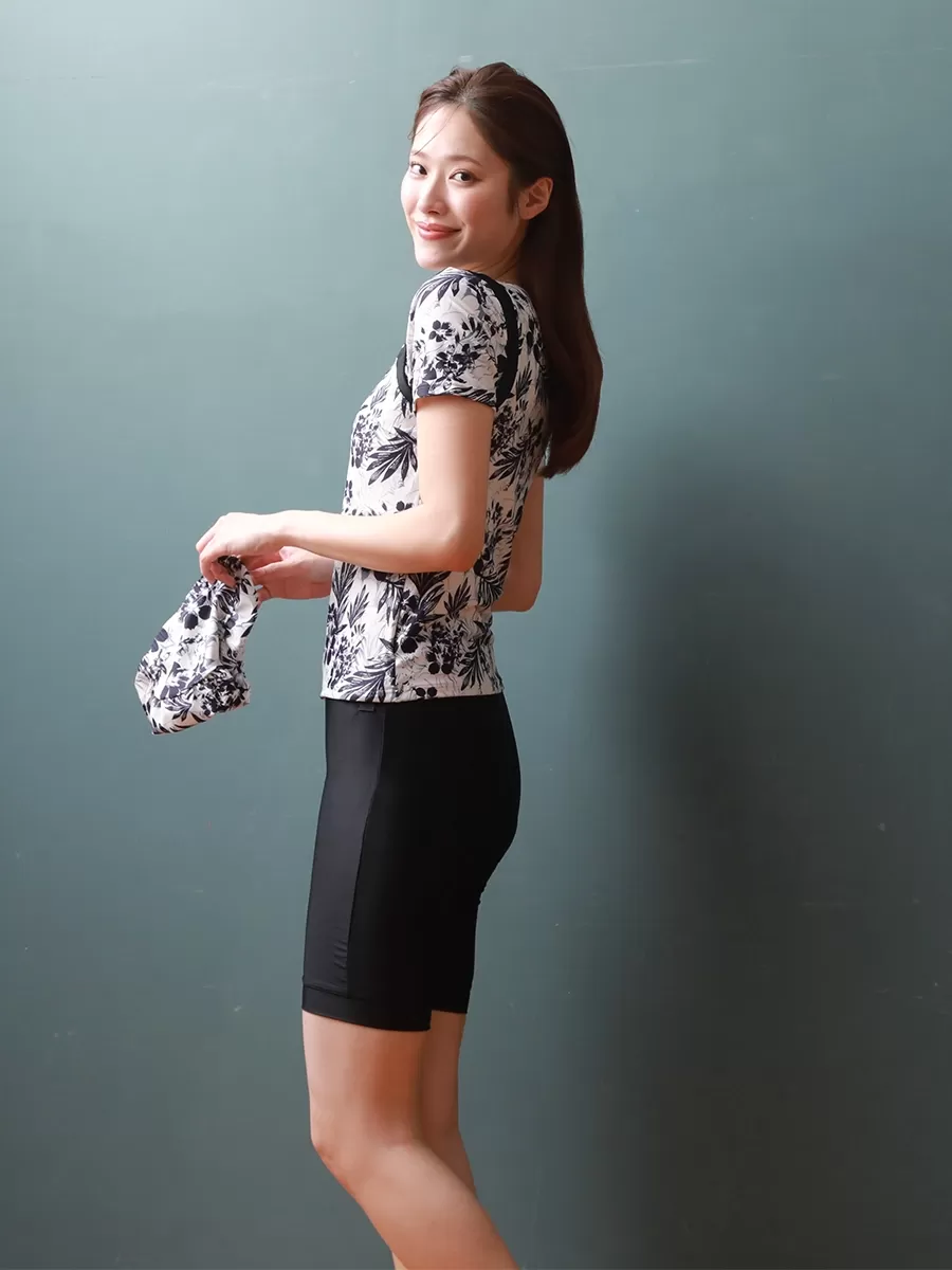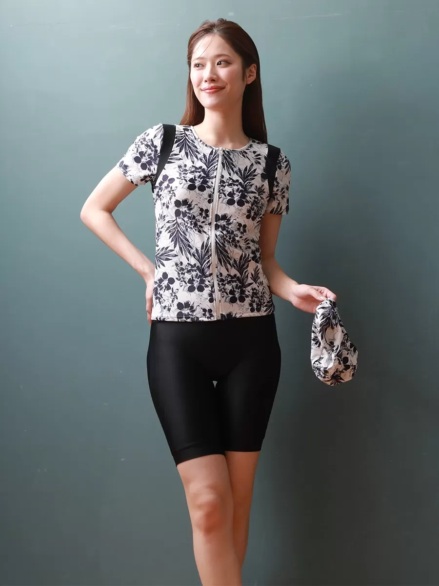 モノクロ線画フラワー半袖フィットネス水着