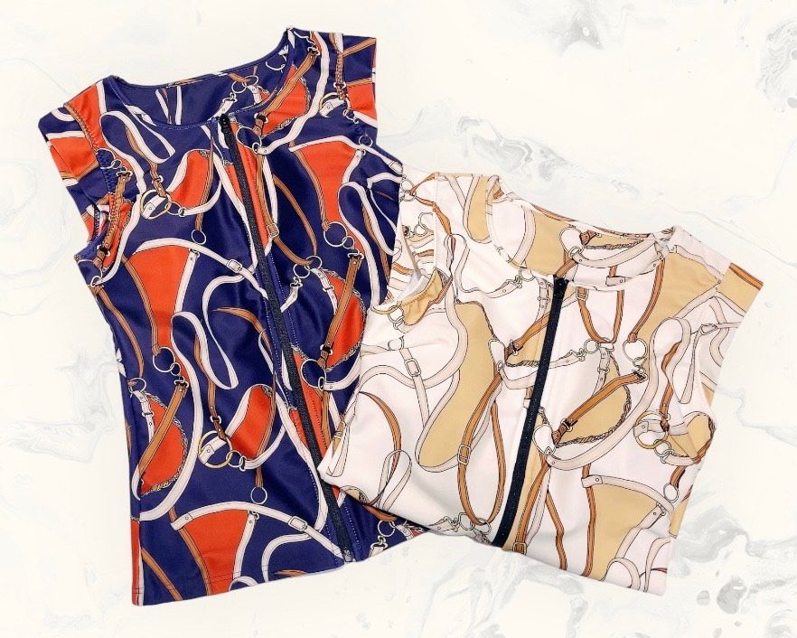ベルトモチーフ柄プチスリーブフィットネス水着