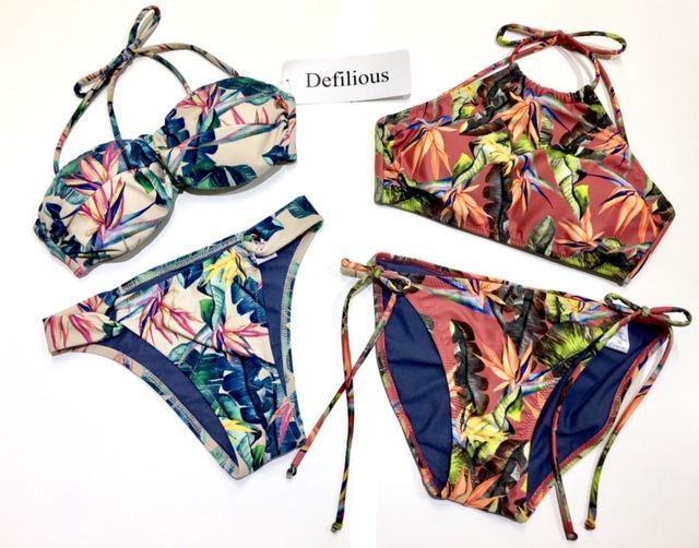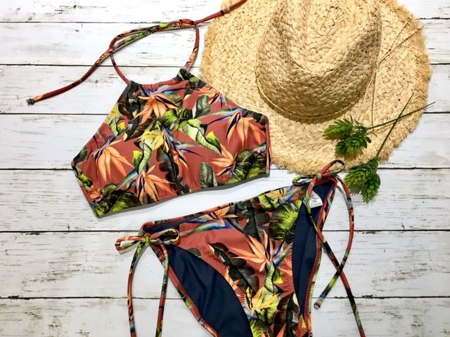 リゾート柄の大人っぽい色味の水着!