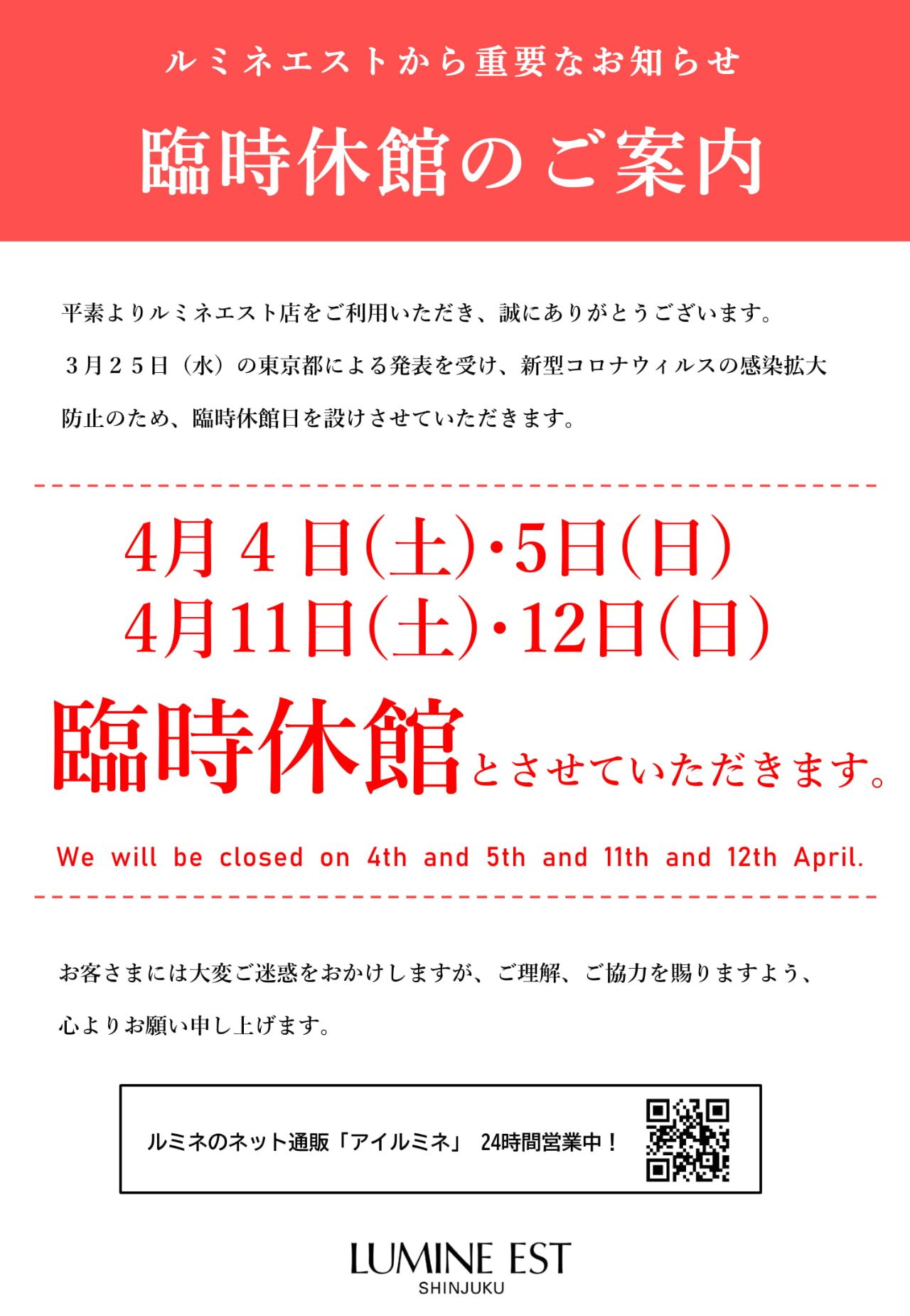 ルミネエスト全館臨時休館とさせていただきます。