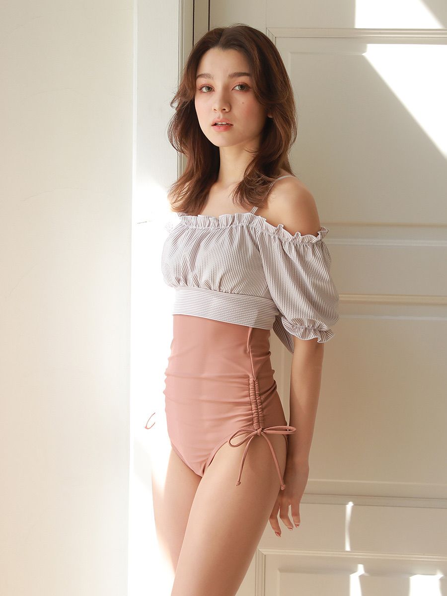 ふんわりボリューム袖のオフショルダーブラと、スーパーハイウエストのショーツを合わせてワンピースに見える『ワンピ見えビキニ』♡