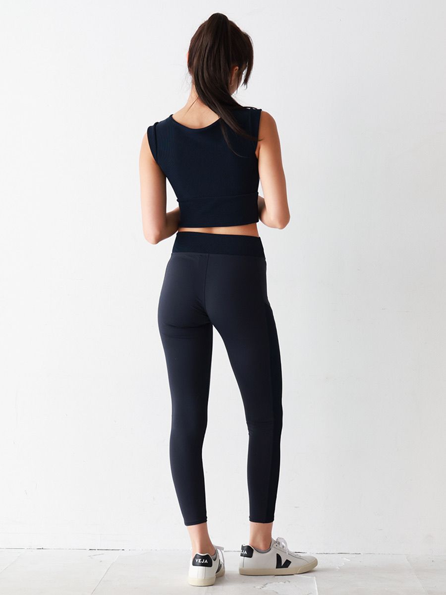 レギンスのウエスト部分のクロスはお腹のスッキリ見せながらオシャレに着れます♪