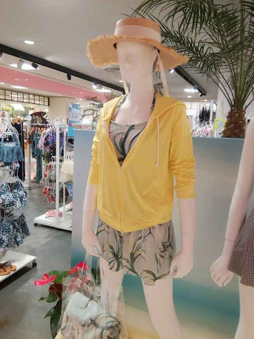 同柄のショートパンツと大判バスタオル、UVパーカーとコーディネート。