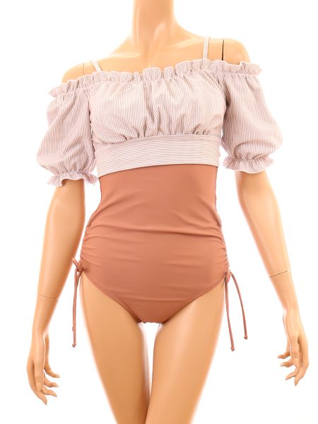 ふんわりボリューム袖のオフショルダーブラと、スーパーハイウエストのショーツを合わせてワンピースに見える『ワンピ見えビキニ』♡