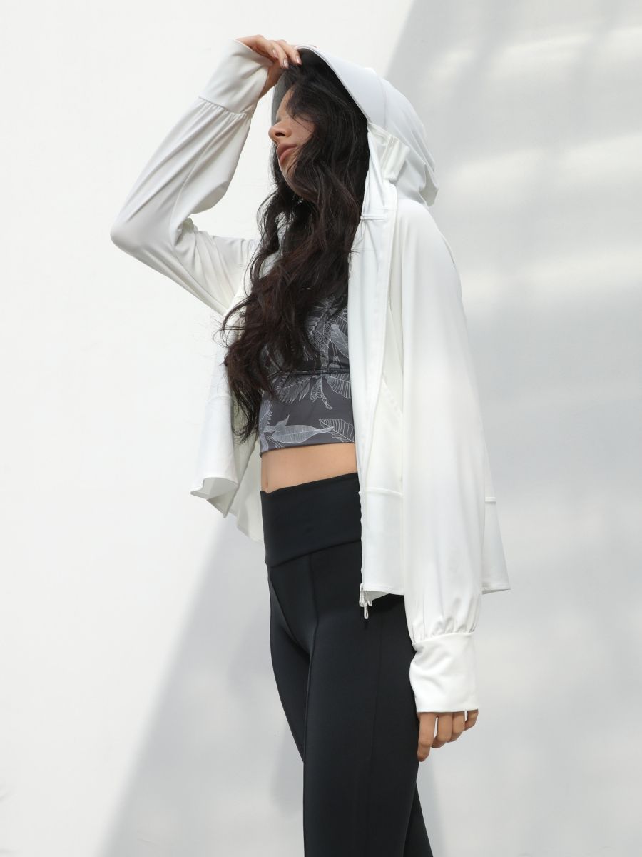 フードにはポニーテールホール付きで、髪を結んだ状態でも着用可能。