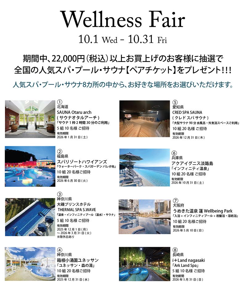 期間中、税込22,000円以上お買い上げの方に抽選で、全国の人気スパ・プール・サウナ[ペアチケット]をプレゼント!!