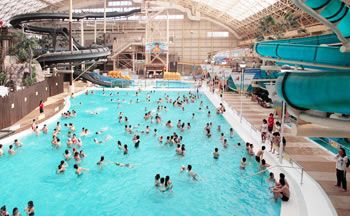 南国ムードの全天候型大ドームは、椰子の木と水に覆われた常夏のパラダイス