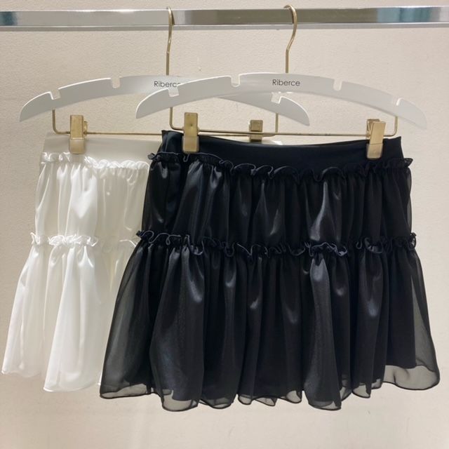 フレアなチュールを重ねた膝上丈のスカートは
