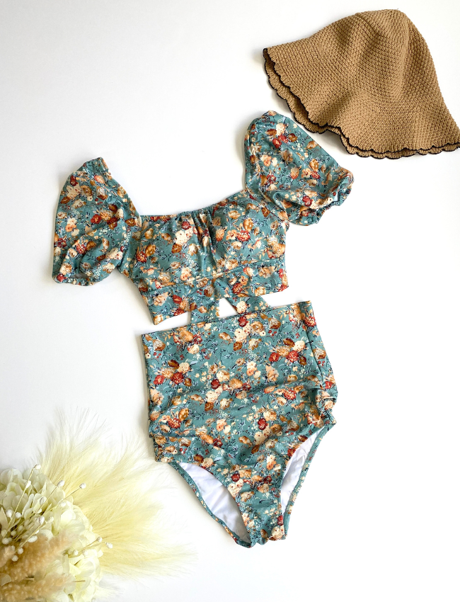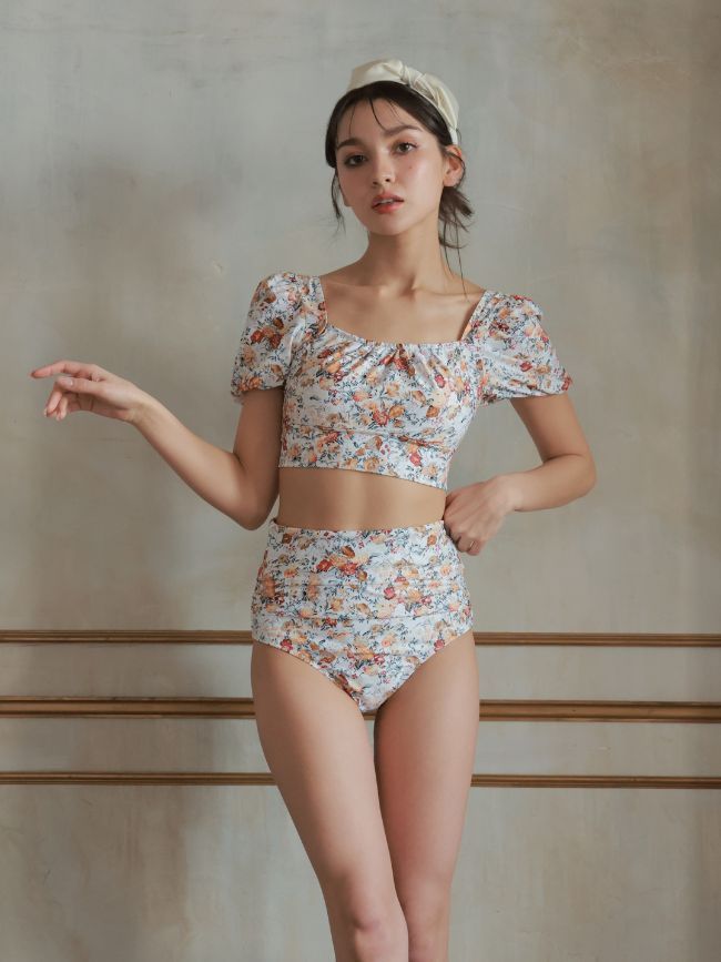 No.248048 レトロ小花柄バックリボンパフスリーブワンピ見えビキニ