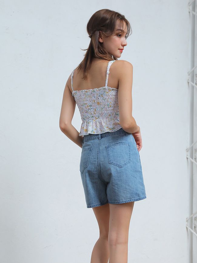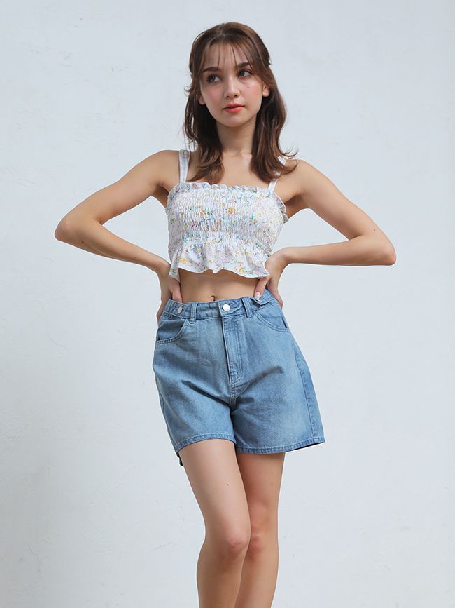 胸元シャーリングバンドゥは絶妙な丈感で可愛らしさを
