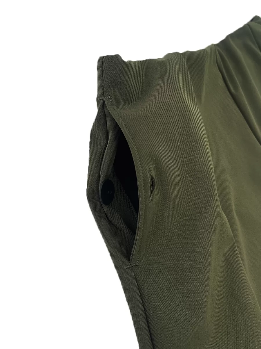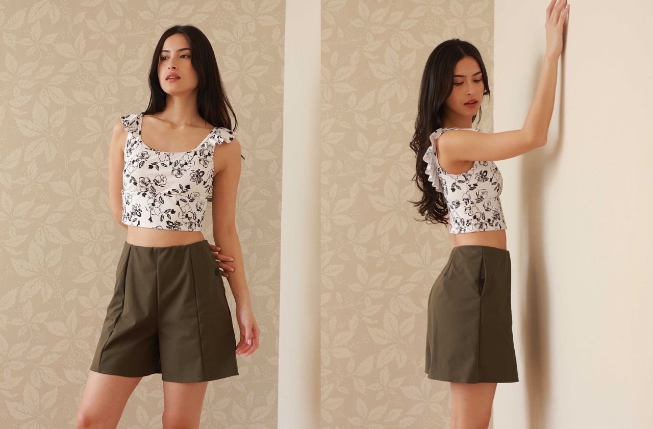 お腹周りを隠したい方はロング丈トップスを合わせて